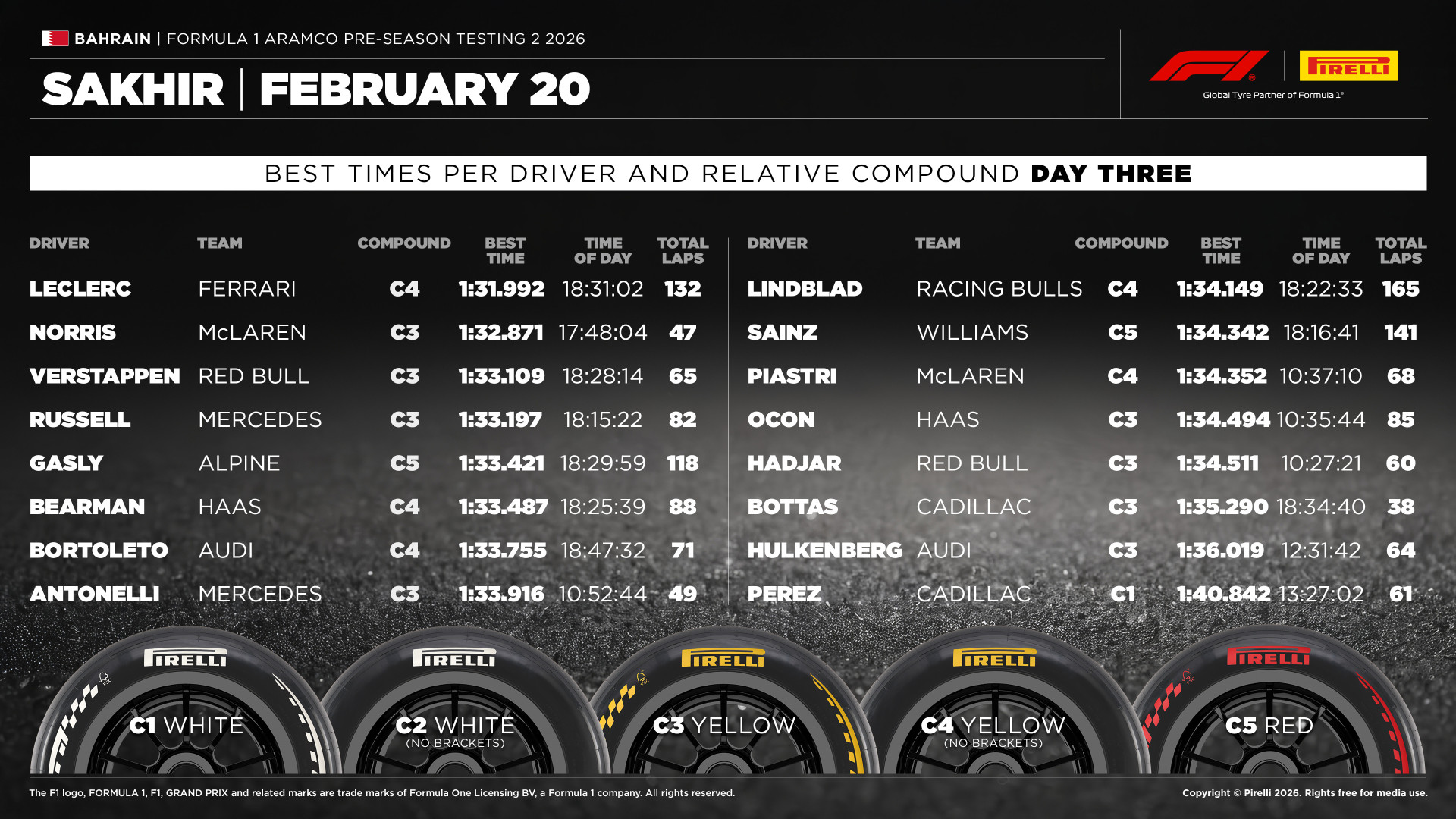 The C5 compound saw limited use on the final day, employed only by Alpine and Williams for short-run simulations. Aston Martin, despite having the tyre available, opted not to run it and instead completed just six laps on C3s before their session was curtailed. In contrast, teams focused on different aspects of performance. Gabriel Bortoleto and Arvin Lindblad set the pace on the harder C1 and C2 compounds, respectively. The day was also notable for the absence of several drivers, including Fernando Alonso, Lewis Hamilton and Alex Albon, who did not participate in any track action.
