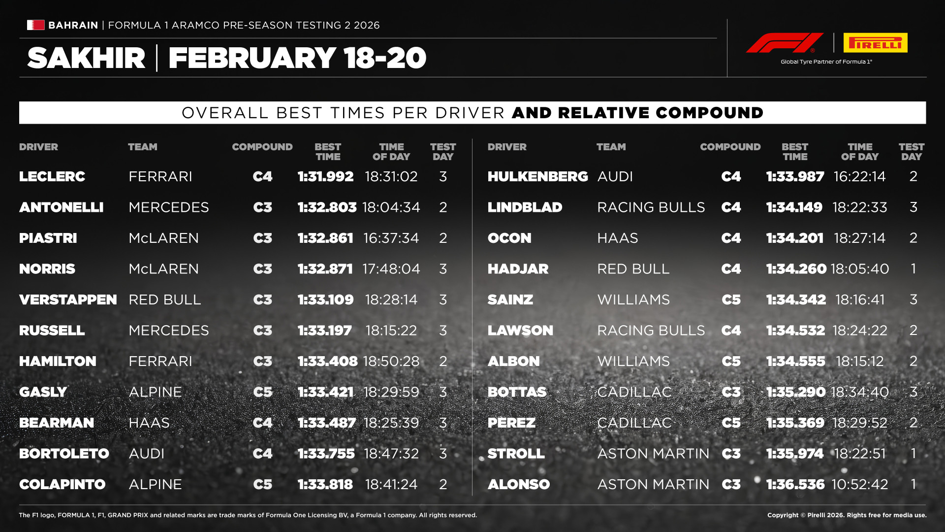 The concluding day of 2026 F1 Pre-Season Testing at the Bahrain International Circuit saw Charles Leclerc set the overall fastest lap of the entire six-day programme. The Ferrari driver delivered a time of 1:31.992s on the C4 compound Pirelli tyres during the final hour of running, improving by eight-tenths of a second on the previous benchmark established by Kimi Antonelli. This performance placed him ahead of Lando Norris in the McLaren, who recorded a 1:32.871s on the C3 tyre. Max Verstappen and George Russell followed, with times of 1:33.109s and 1:33.197s, respectively, both also set on the C3 compound. Notably, none surpassed Leclerc's own leading time on that particular compound, a 1:32.655s. Pierre Gasly rounded out the top times, utilising the softest C5 tyres to post a 1:33.421s.
