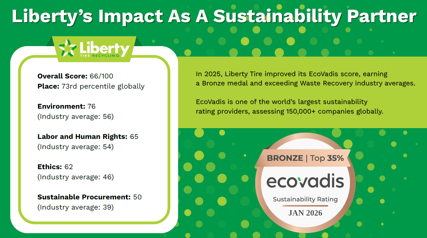 Amy Brackin, Senior Vice President – Sustainability, Liberty Tire Recycling, said, “This recognition affirms that our sustainability strategy is ambitious, measurable and credible. Earning a Bronze medal in our second year demonstrates that Liberty is a partner our customers can rely on to help meet their own circularity and responsible sourcing goals.”